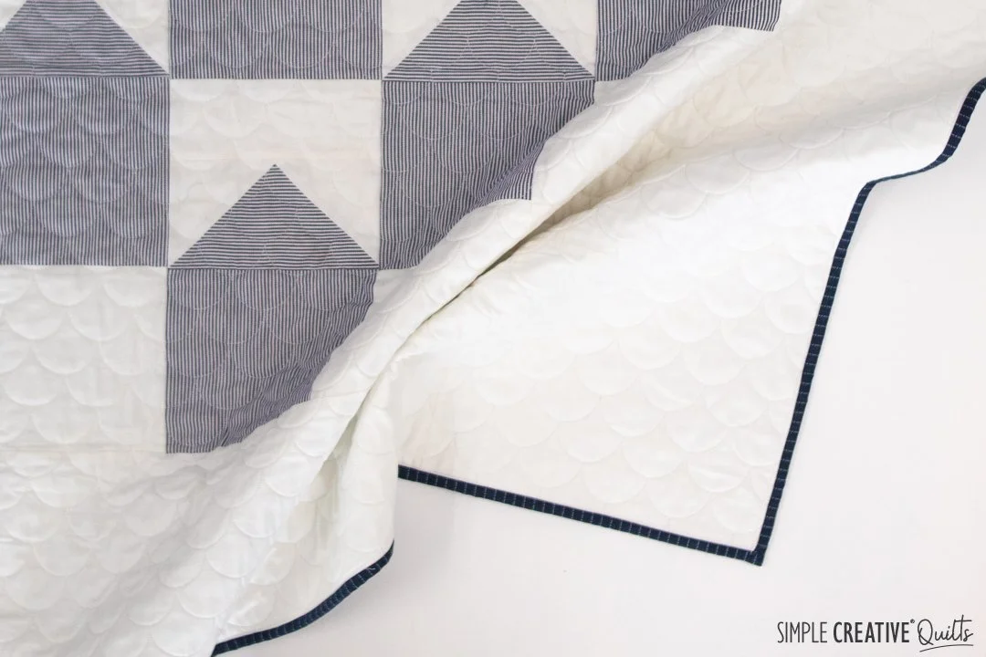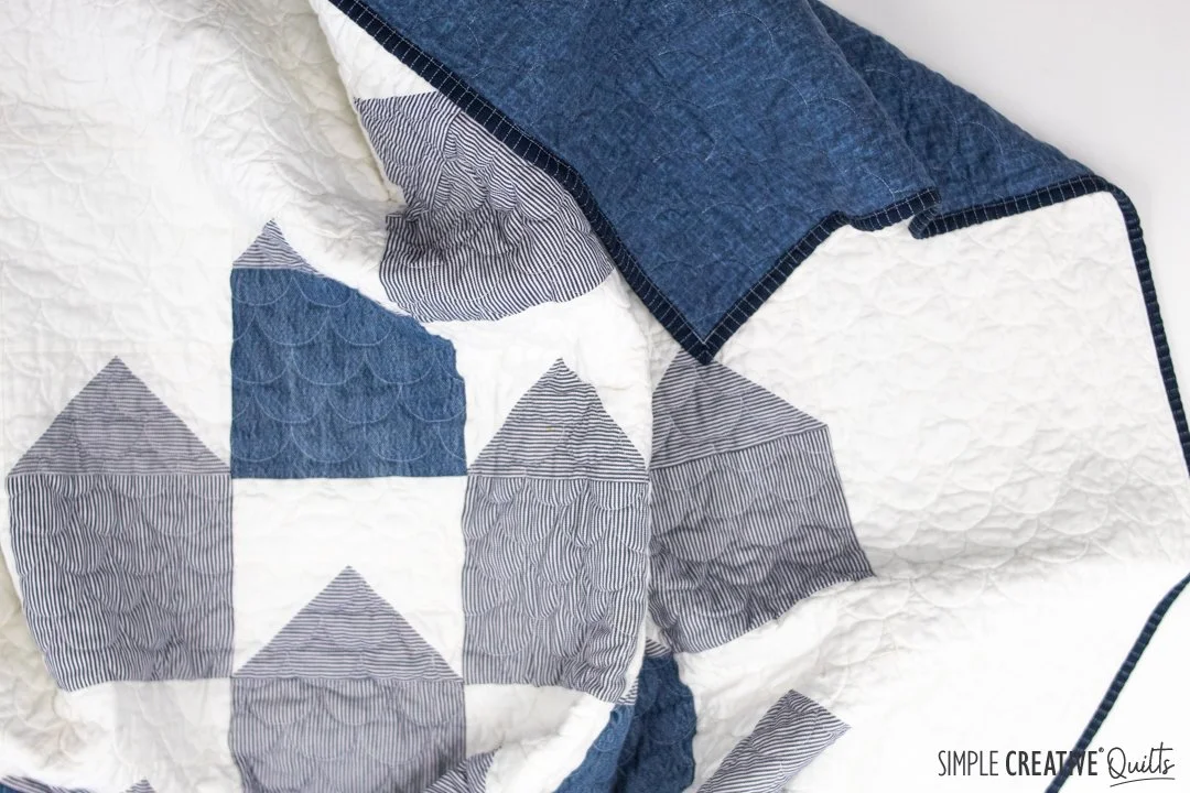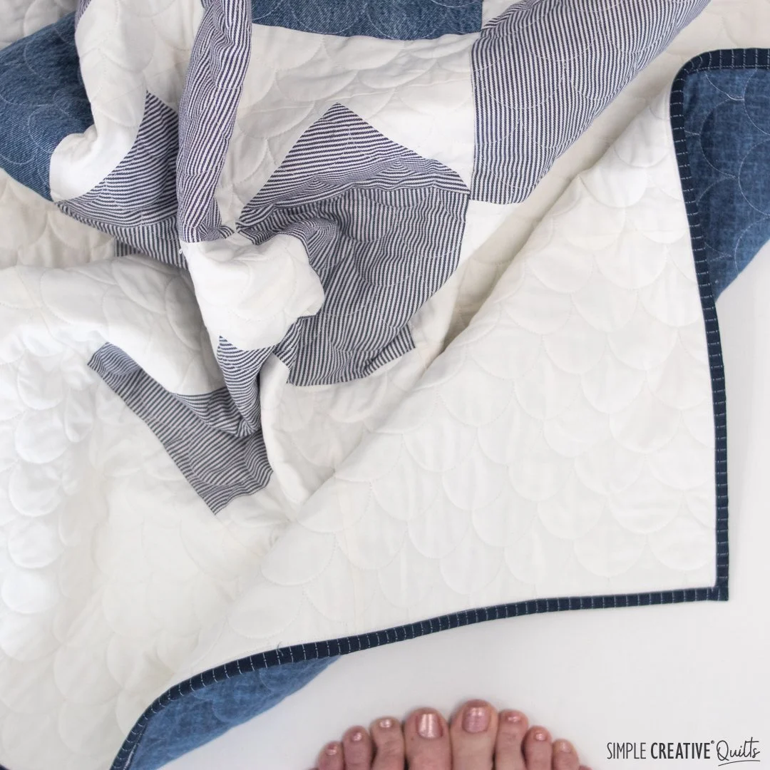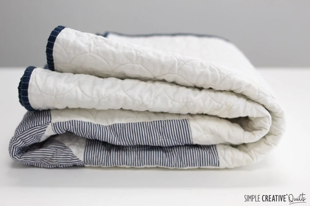 We chose clamshells for the quilting to mimic the rounded shingles you would see on the gable of a house. My quilter, Pam of Piece Love and Quilting, did a great job though we pushed her machine to the ultimate limit having the shells as small as we wanted. For the binding I considered using strips from the work shirts, but in the end I decided to use regular quilting cotton and found this perfect indigo stripe at my local quilt shop. I love how it turned out.