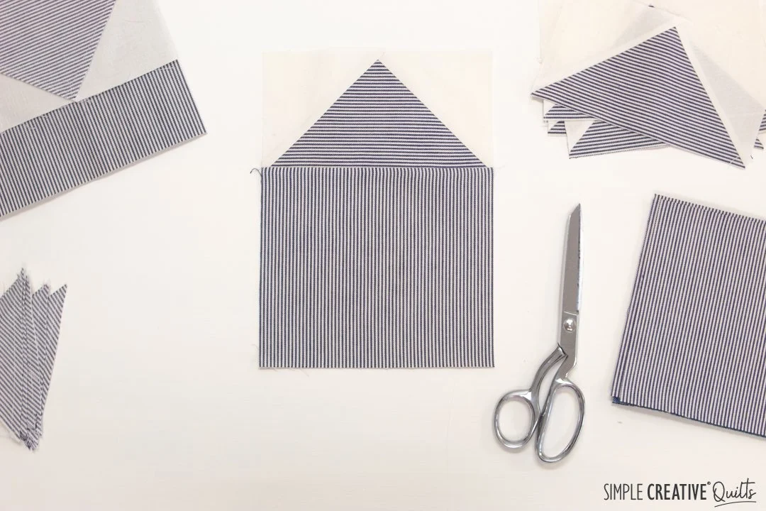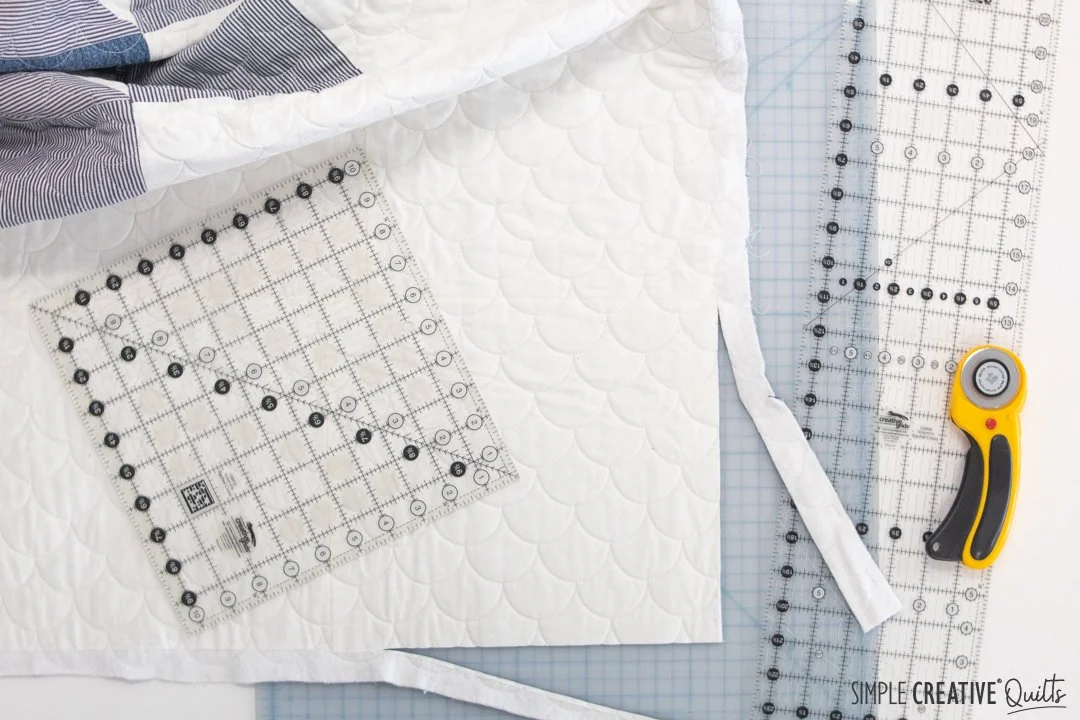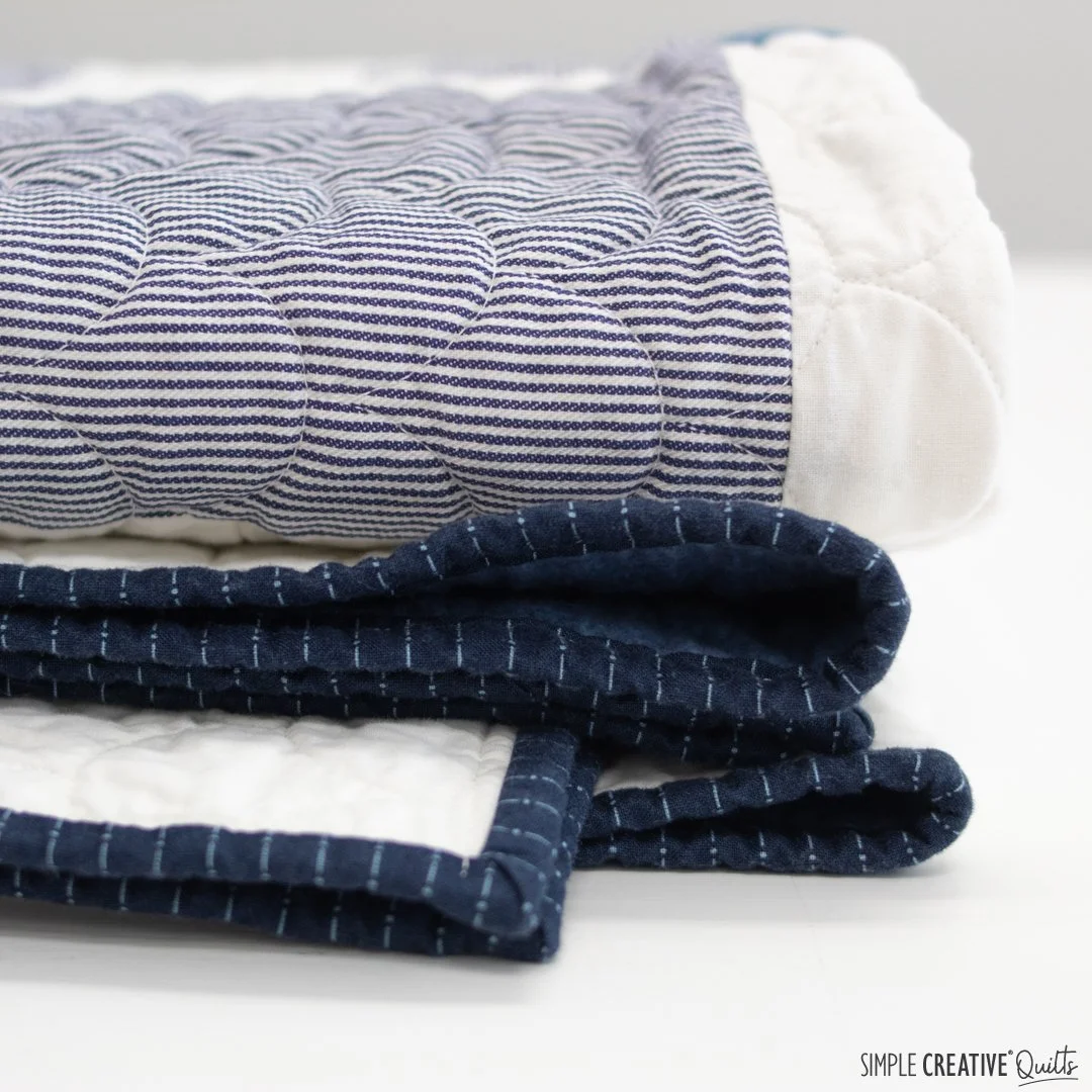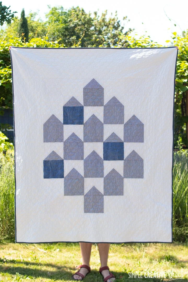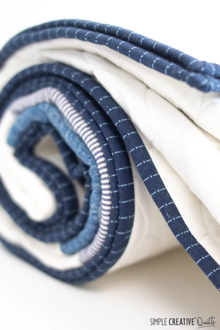 We chose clamshells for the quilting to mimic the rounded shingles you would see on the gable of a house. My quilter, Pam of Piece Love and Quilting, did a great job though we pushed her machine to the ultimate limit having the shells as small as we wanted. For the binding I considered using strips from the work shirts, but in the end I decided to use regular quilting cotton and found this perfect indigo stripe at my local quilt shop. I love how it turned out.