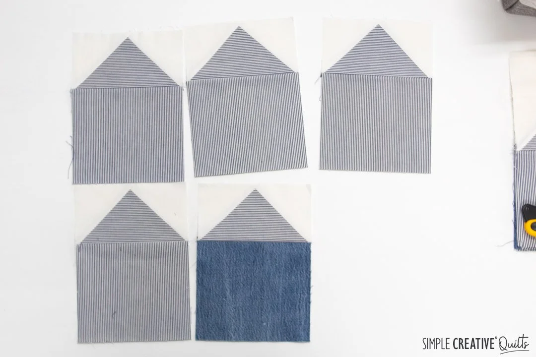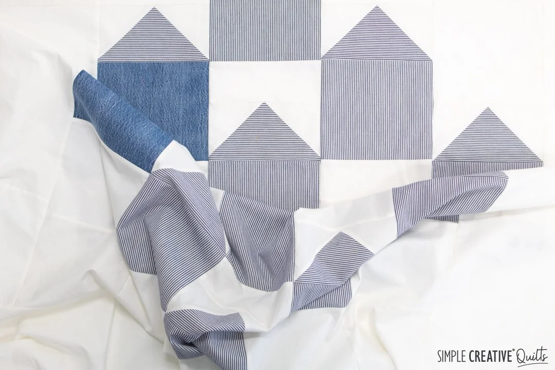 My friends’ father was a carpenter and built houses for a living, so we chose a house block quilt for her, and I used her fathers’ work shirts and jeans to make the blocks. There are risks to using such a variety of materials in a quilt—the heavy denim and work shirts with standard quilting cotton—there’s a chance that the heavier weight fabrics will pull and stress the lighter weight fabrics and cause the quilt to come apart or the fabric to fail prematurely. But for this quilt my friend said it was worth the risk, and I agree with her. The palette of blues and whites and his shirts and jeans building the houses, the village. It couldn’t be more perfect.